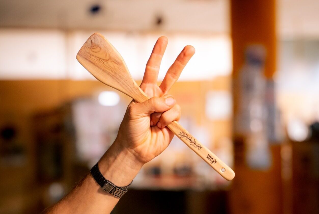 The wooden spatulas have been a success of Habibi.Works’ Winter Campaign of 2024. Habibi.Works is a makerspace distinguished by creativity, craftsmanship and a responsible use of resources. For this reason, the remaining spatulas from the last Winter Campaign have been updated with the laser-cut engraving of an olive branch. The engraving has been designed by our team members Nathalie and Mhamed, while the wooden spatulas have been crafted in our woodworkshop by Mhamed, Samuel and Sergio.